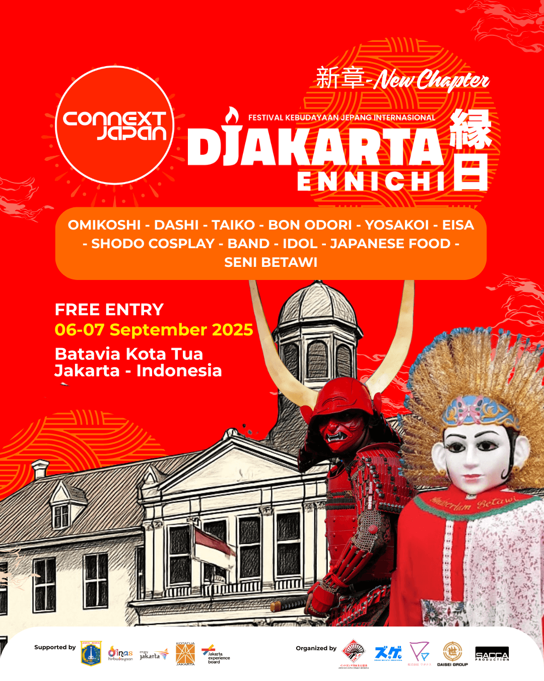 Connext Japan Djakarta Ennichi rencananya akan digelar pada 6–7 September 2025 di kawasan bersejarah, yakni Batavia, Kota Tua, Jakarta Barat. Lokasi itu dipilih sebagai simbol pertemua antara sejarah kota Jakarta dan jejak budaya Jepang di Tanah Air.